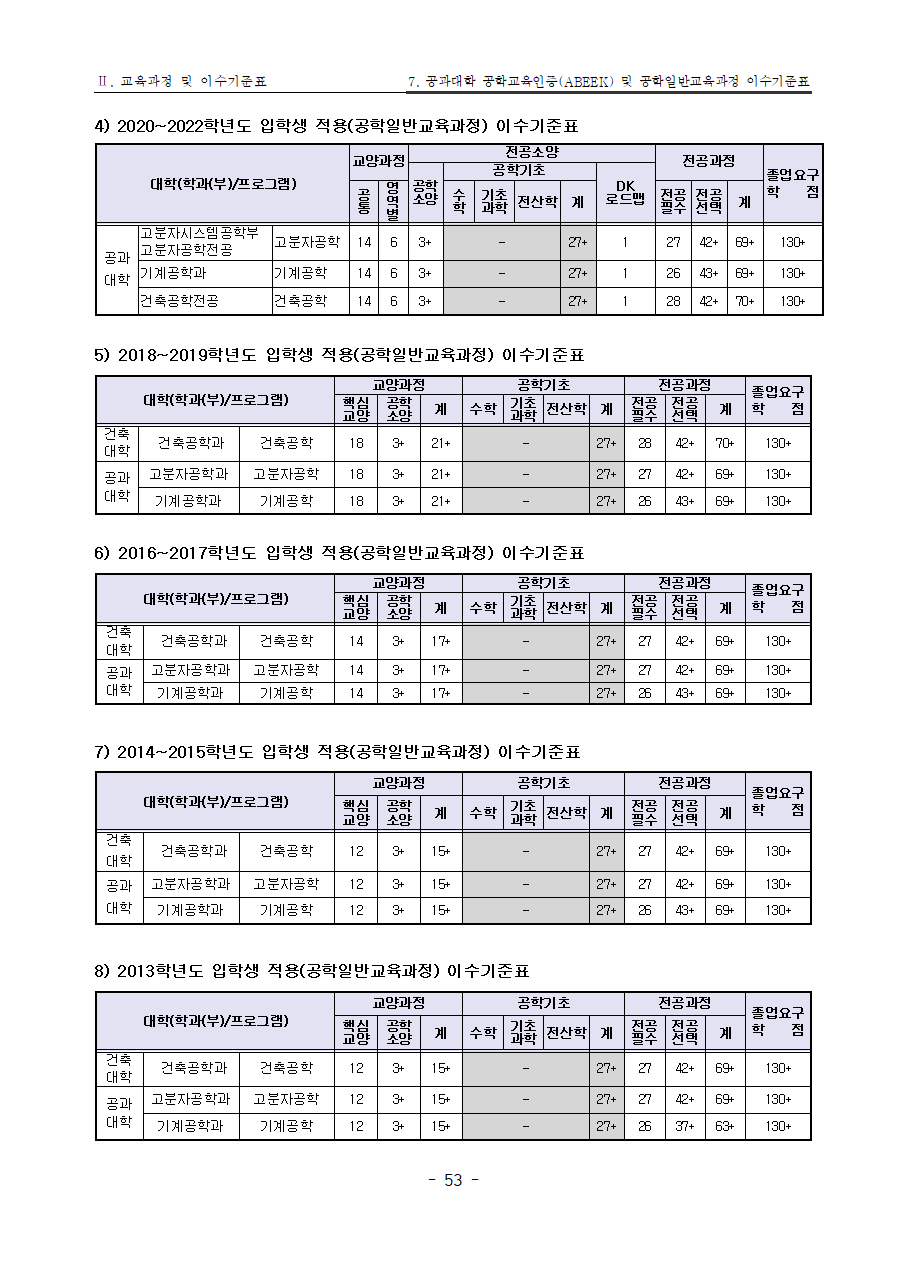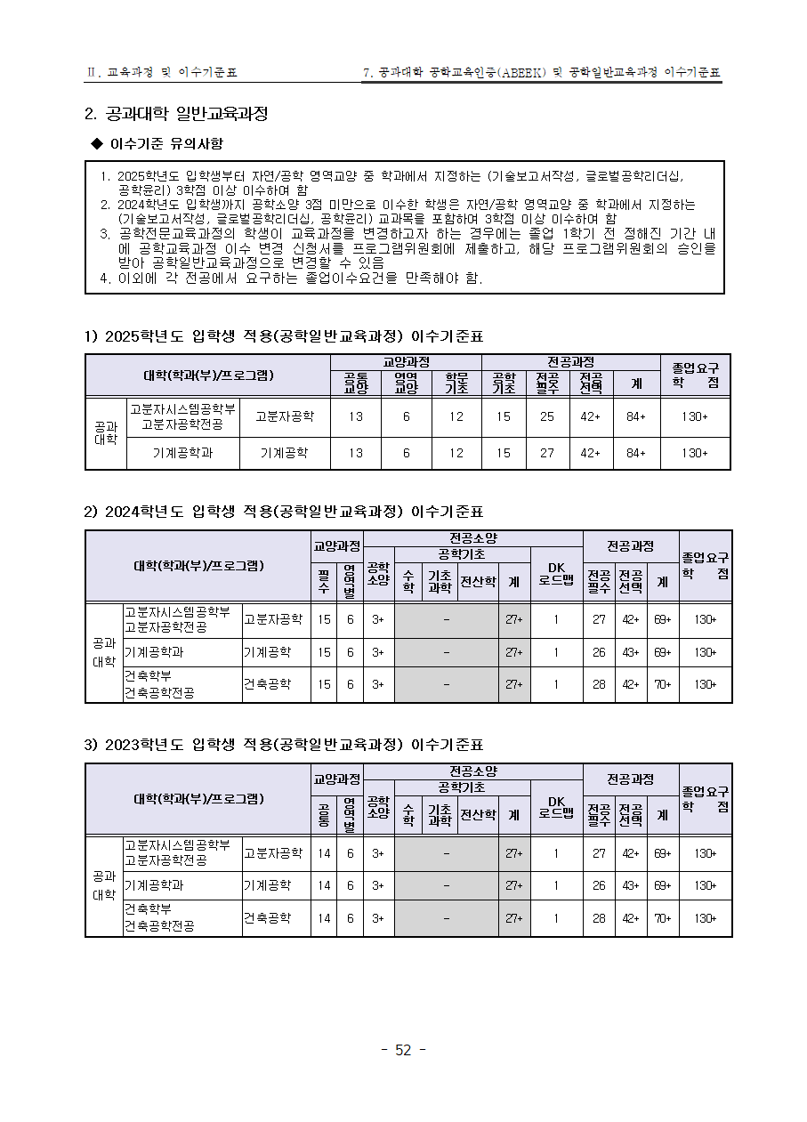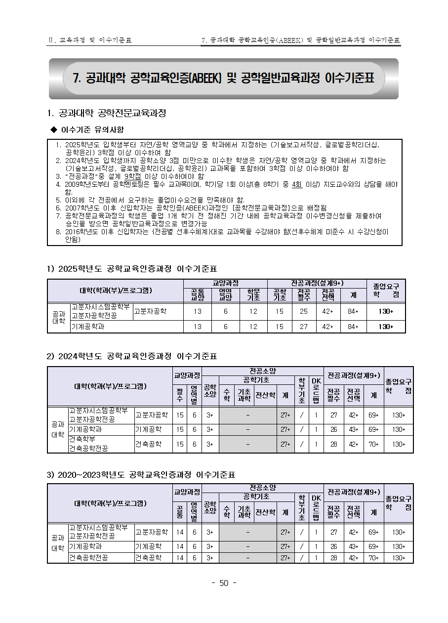 - 전과 및 편입생과 2003학년도 이전 입학생은 전문교육과정으로의 이수과정을 1회에 한하여 변경할 수 있다. 공학전문교육과정에서 공학 일반교육과정으로 변경한 학생은 공학전문교육과정으로 재변경을 인정하지 아니한다.