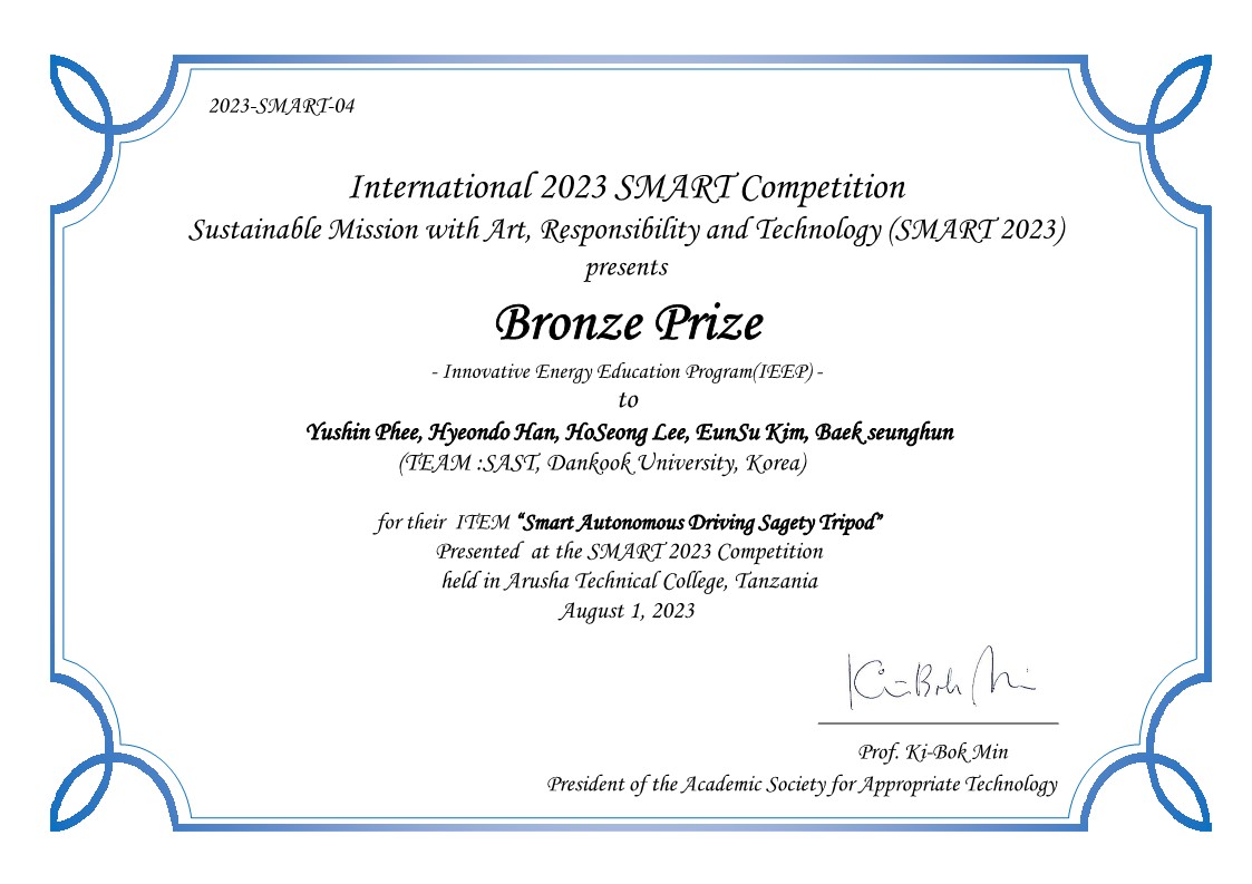 SMART 경진대회는 8월 1일 탄자니아에서 개최되었으며, 전세계에서 온오프라인으로 참여하는 국제 경진대회이다. 적정기술학회가 주최한 International 2023 SMART 경진대회에서 기계공학과 캡스톤디자인 팀이 동상을 수상했다. 동상을 받은 SAST팀은 (팀원: 김은수, 백승훈, 이호성, 피유신, 한현도/ 지도교수: 송지현, 지성철) 사고시 운전자의 안전을 위해 자율주행이 가능한 안전삼각대를 개발하였다.