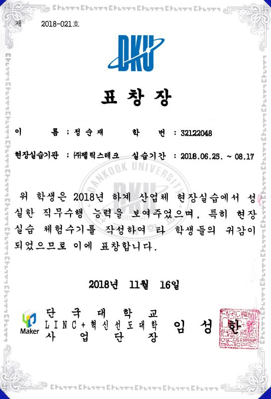 1. 일시 : 2019. 06. 14 2. 장소 : 1공학관 515호 세미나실 3. 수여자 : 천재현, 장재영, 김동훈, 김희수, 박범진