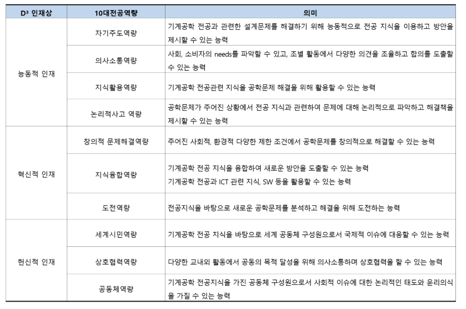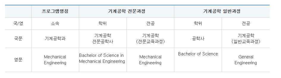 본 전공은 입학생을 위한 4년의 정규과정으로 기계공학전문교육과정을, 편입생을 위해서는 기계공학 일반교육과정을 운영한다. 전문교육과정은 한국공학인증원에서 제시하는 인증요건을 만족하는 것을 목표로 설계되어 있다. 2003학년도 이전 입학생과 2005학년도 이전 편입생에게는 당시의 졸업기준과 학위명칭이 적용된다.