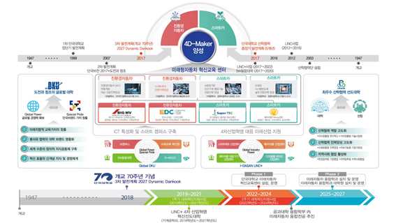 단국대학교 기계공학과와 전자전기공학과, 컴퓨터공학과는 [미래형자동차 기술융합혁신인재양성사업]을 통해 미래차 분야의 국내외 산업/시장 동향 및 대학의 비전·목표·인재상, 직무 역량 및 인력수요 분석을 토대로 융합기술 기반 미래형자동차 혁신인재 (4D-Maker) 양성을 목표로 하고 있습니다. 우리대학의 10대 전공역량을 바탕으로 한 4C핵심역량과 4D실천역량 향상을 위해 선도 융합교육과정, 융합교육방법, 융합교육환경을 구축하고 운영합니다.